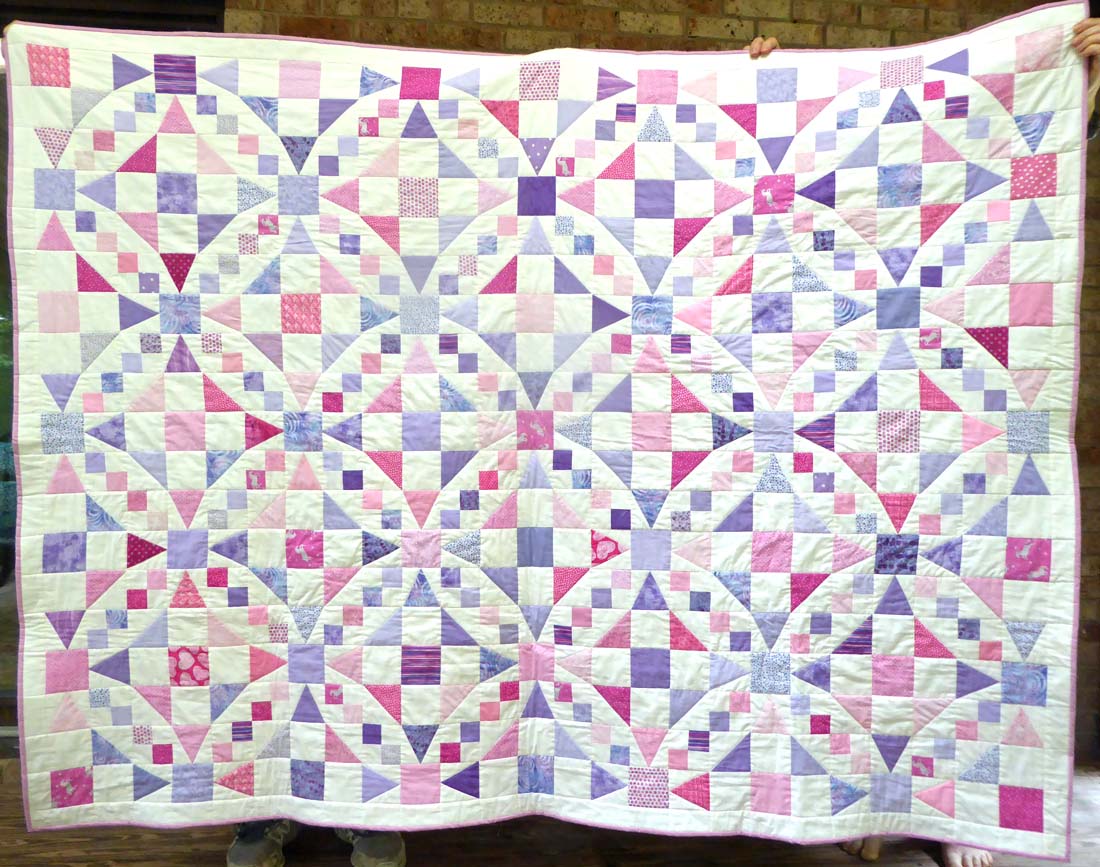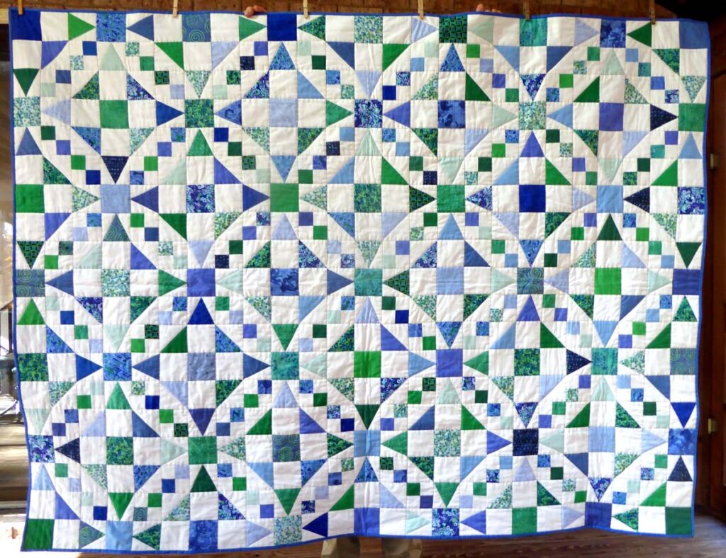 This is a closeup of the design. Although it apoears to have circles, all the seams are straight lines. There are only 4 different 3″ blocks in the quilt: