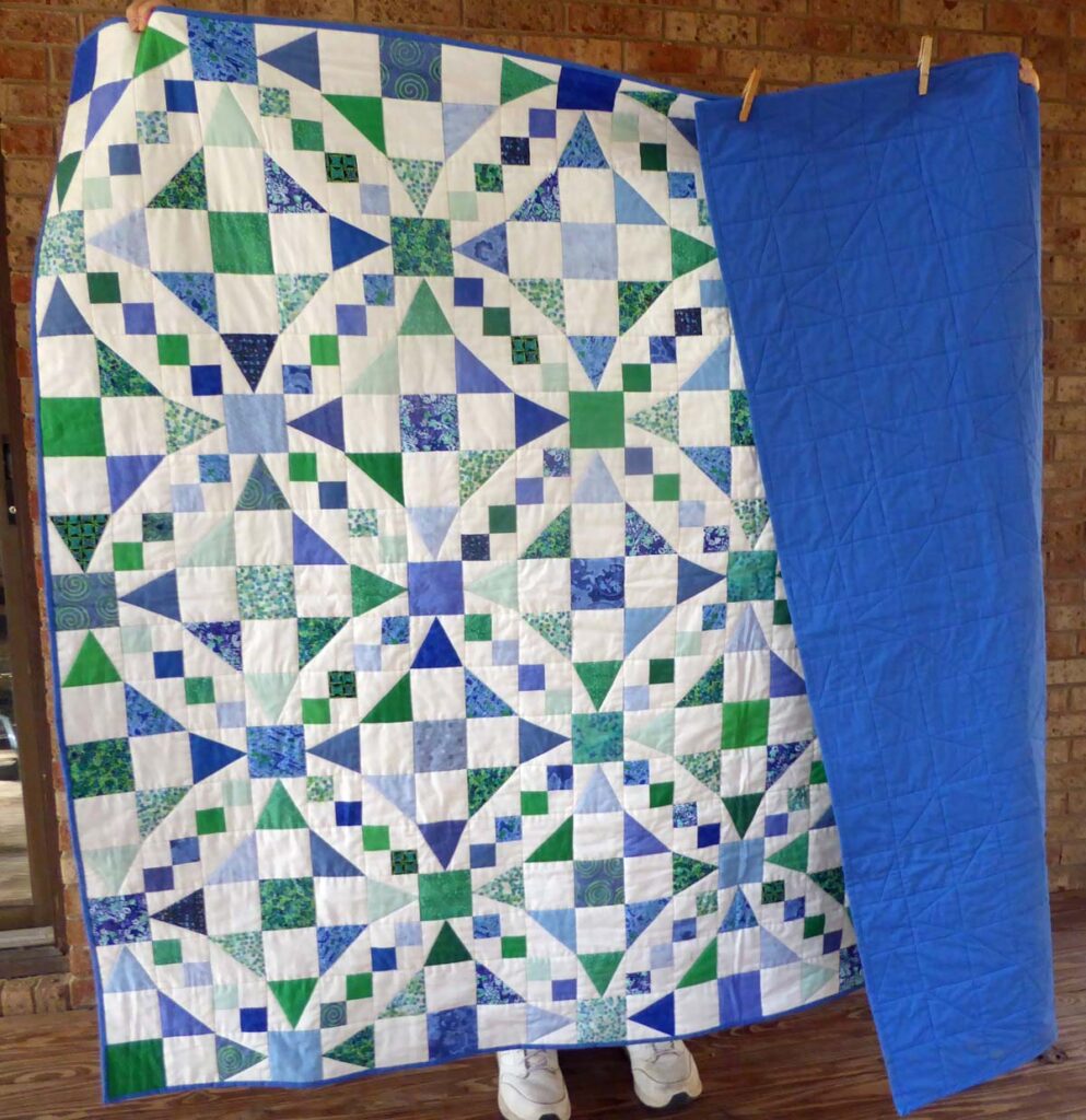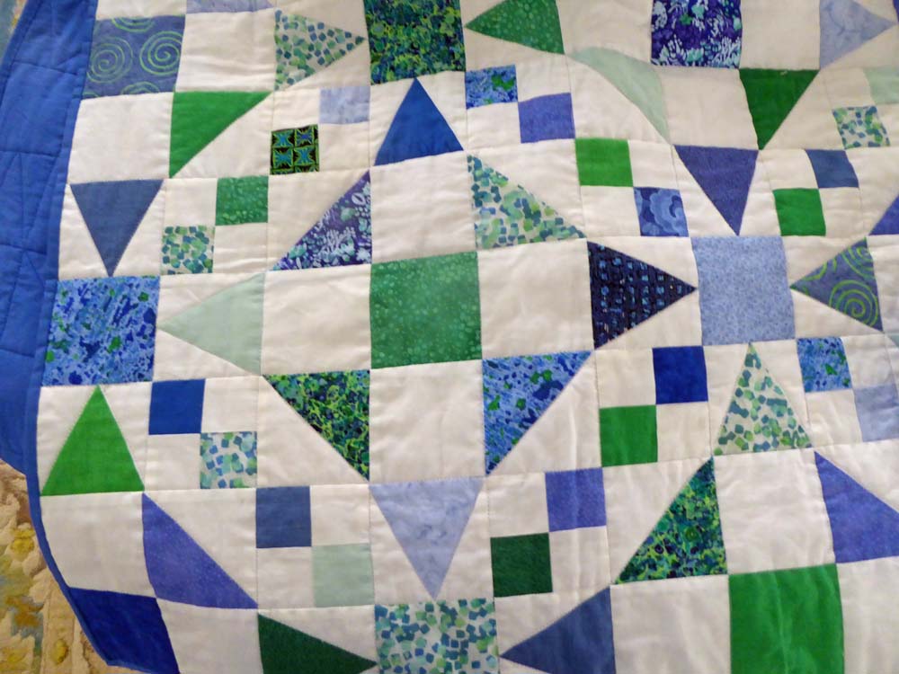 I could not find a wide backing fabric I liked for this quilt so it ended up with a solid blue.