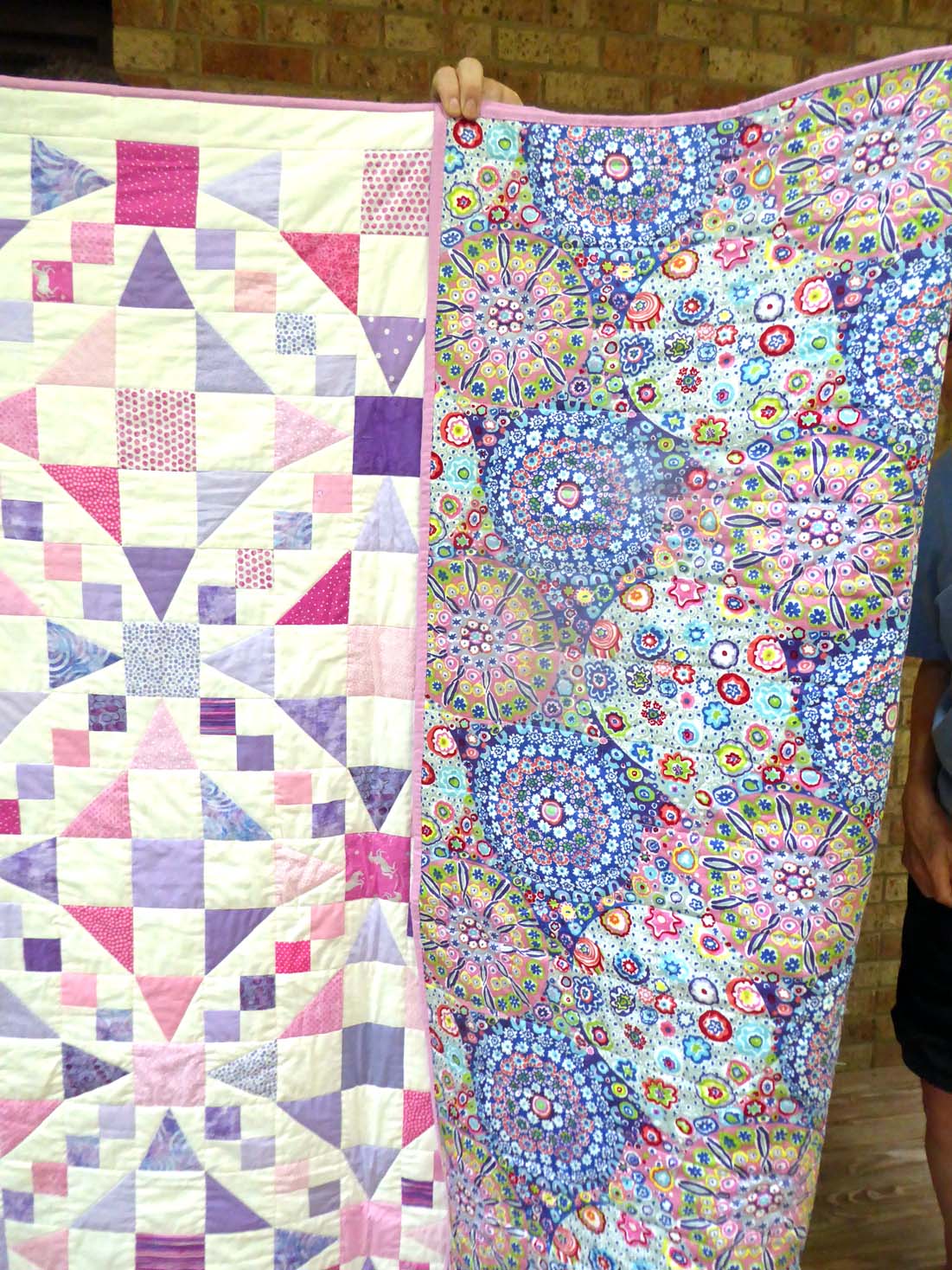 The backing for the pink and lavender quilt is a pink and lavender Millefiore Wide Cotton Sateen Quilt Back by Kaffe Fassett Pastel from Backside Fabrics